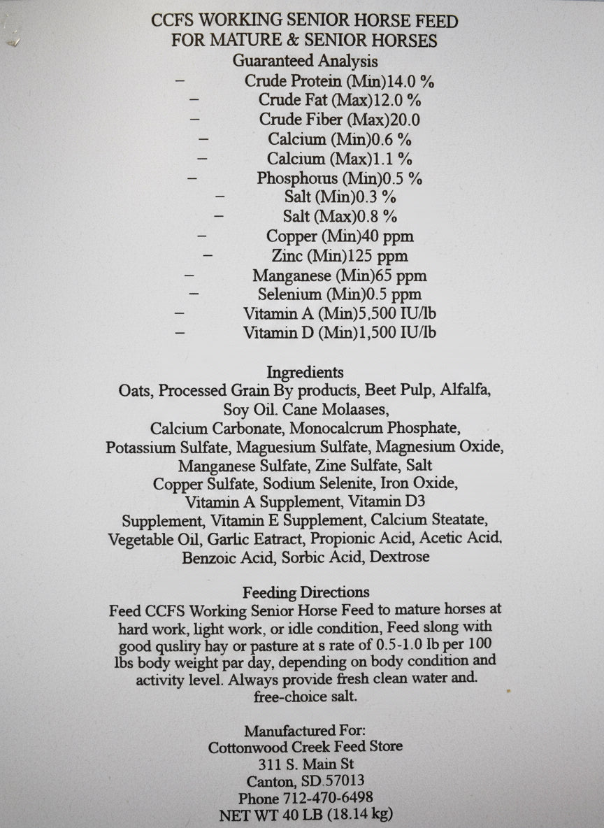 A feed designed to meet the requirements of the working/hard keeper senior horse. Feed has an awesome blend of digestible fiber and fat meant to keep them going and keep weight on. A high quality mineral/vitamin pack and high concentration of omega 3 & 6 oils. 40# bag.