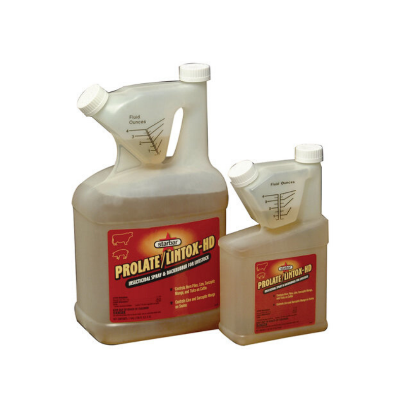 Prolate/Lintox-HD is a highly effective organophosphorous insecticide. Use as a spray to control lice and mange on swine or to control horn flies, lice, mange and ticks on cattle. One quart mixes with 25 gallons of water and will treat up to 100 hogs. One day withdrawal for swine. One quart makes up to 200 gallons spray for use on beef and non-lactating dairy cattle. Three days slaughter withdrawal for cattle. Cattle rub: mix 1 gal/50 gal diesel.